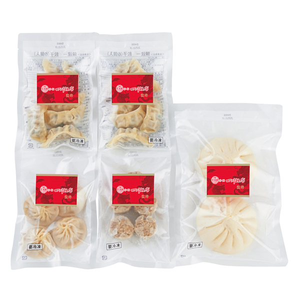 餃子120g(6個入)×2、手包み肉まん240g(2個入)、貝柱入焼売150g(5個入)、小籠包140g(4個入) 【乳成分・小麦】