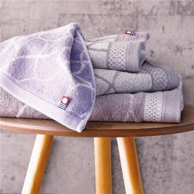落ち着いた色合いでモダンなデザインのタオルです。タオル名産地・今治で織り上げたタオルは、使いはじめから吸水性がよく、ふんわりした風合いが長続きします。