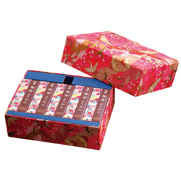 とろろ懐石料理店「浅草むぎとろ」の本店懐石料理の人気デザートから生まれた珈琲ようかんはすっきりと上品な甘さ。かわいい着物地の文庫箱に入れてお届け致します。