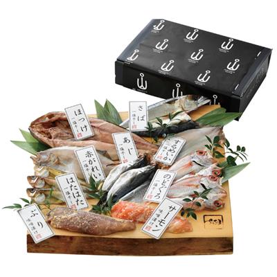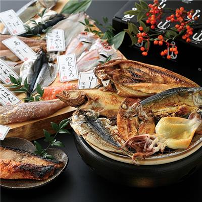 開きほっけ200g、開きさば170g、干し赤がれい170g、開きあじ70g×2、開きのどぐろ70g×2、干しはたはた(3?4尾)100g、開きいか70g、ぶり味噌漬け70g、ふくいサーモン味噌漬け60g