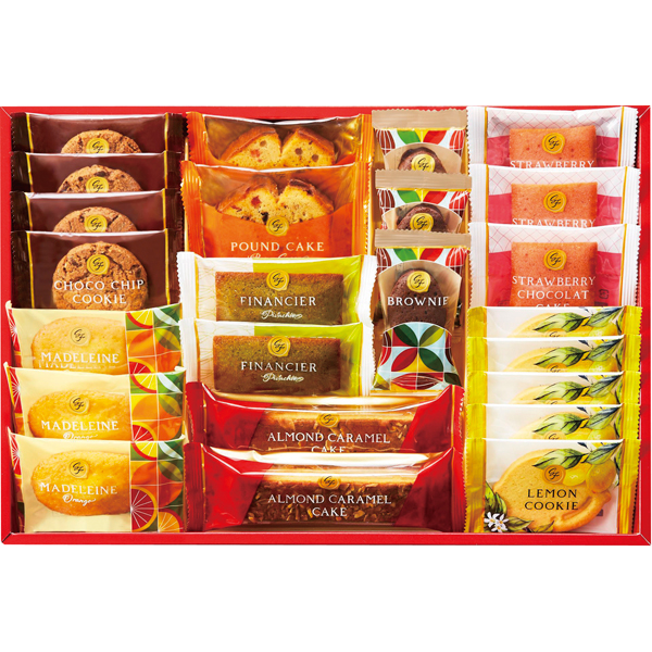 (ブラウンシュガーパウンドケーキ・アーモンドキャラメルケーキ・ピスタチオフィナンシェ)各2、(オレンジマドレーヌ・ストロベリーショコラケーキ・ブラウニー)各3、チョコチップクッキー×4、レモンクッキー×5 【卵・乳成分・小麦】