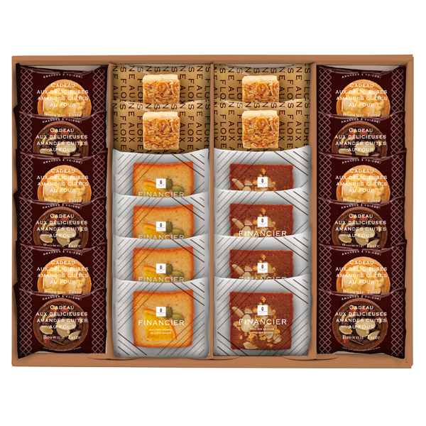 フィナンシェ(オレンジ・キャラメルアーモンド)各4、ホワイトブラウニータルト×6、ブラウニータルト×6、フロランタン×4 【卵・乳成分・小麦】