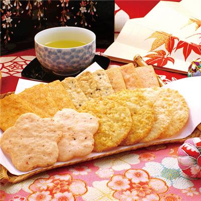 国産米100%の煎餅の詰合せです。加賀友禅をモチーフに色鮮やかにデザインされた目で見てきれいな米菓ギフトです。