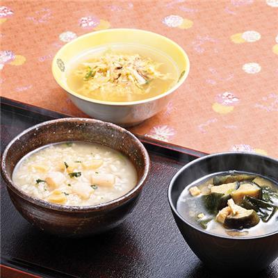 たまごスープ×3、わかめと油あげの味噌汁×2、三ツ葉と卵のスープ 【卵・小麦】