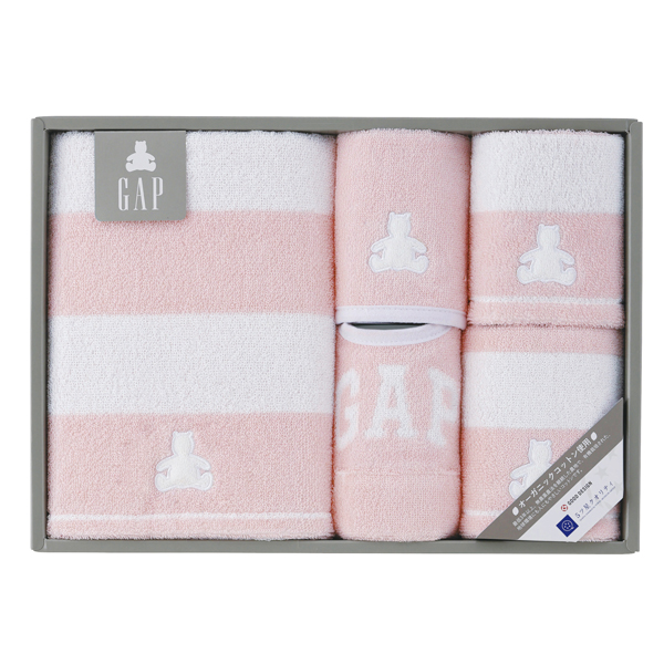 ミニバスタオル450×900mm、ベビーフェイスタオル250×600mm、ウォッシュタオル250×250mm、ミニハンカチ200×200mm、スタイ200×315mm