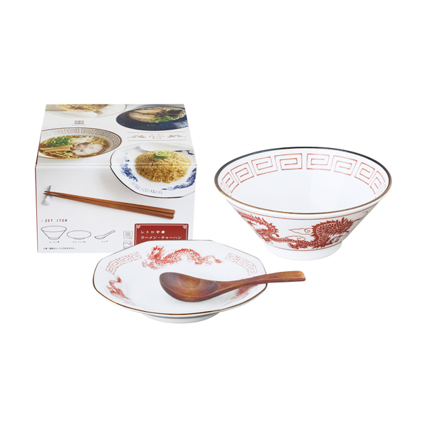 ラーメン丼φ19.5×80mm・チャーハン皿190×190×35mm:磁器、レンゲスプーン160mm:天然木