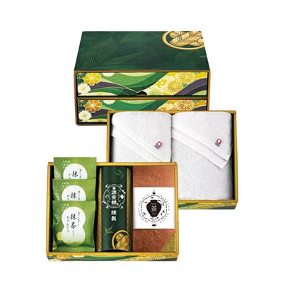 抹茶かすてら1本・煎茶30g×2・抹茶かりんとう10g×3・今治フェイスタオル340×780mm×2 【卵・乳成分・小麦】
