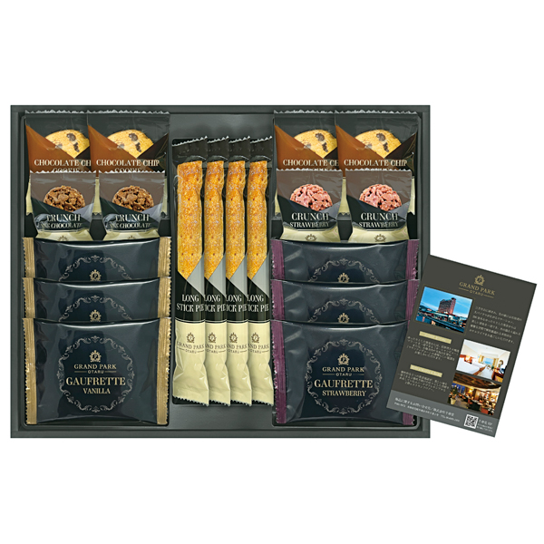 ロングスティックパイ×4・ゴーフレット(バニラ・ストロベリー)各3・チョコクランチ(ミルク・ストロベリー)各2・チョコチップクッキー×4 【卵・乳成分・小麦】
