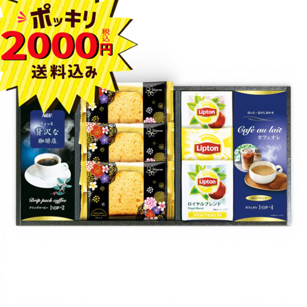 AGFちょっと贅沢な珈琲店スペシャルブレンド(7g×2袋)・リプトンティーバッグ(イエローラベル2g・セイロン2.2g・ロイヤルブレンド2.2g)・カフェオレ(12g×4袋)・金澤兼六製菓オリジナルケーキ(プレーン)×3 【卵・乳成分・小麦】