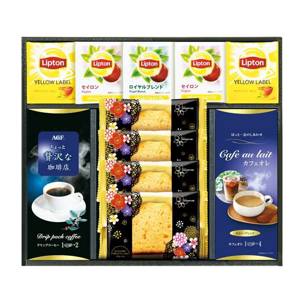 AGFちょっと贅沢な珈琲店スペシャルブレンド(7g×2袋)・リプトンティーバッグ(イエローラベル2g×2・セイロン2.2g×2・ロイヤルブレンド2.2g)・カフェオレ(12g×4袋)・金澤兼六製菓オリジナルケーキ(プレーン)×4 【卵・乳成分・小麦】