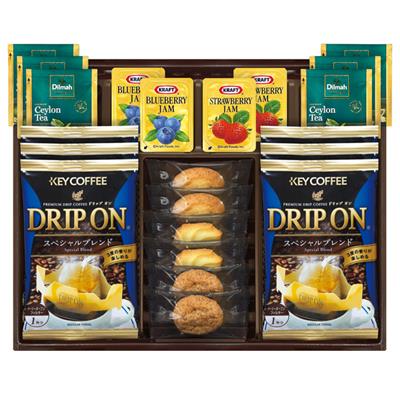 キーコーヒードリップオン8g×6・プチクッキー(リング・ペカン・カシュー)各2・ディルマ セイロンティー2g×6・ジャム(ストロベリー・ブルーベリー)14g×各2 【卵・乳成分・小麦】