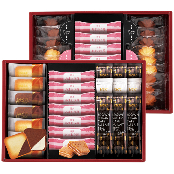 ■商品: | はかたあまおう苺チョコサンド×14・絞りクッキー(ココア・プレーン・コーヒー)各6・ラングドシャ(プレーン×4枚・チョコ×2枚)・UCCスティックコーヒー(黒糖入りカフェオレ×6・ミルクリッチカフェオレ×3) 【卵・乳成分・小麦】 |