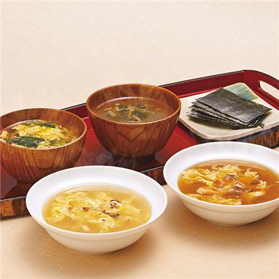 ふかひれスープ160g×2・紅ずわいがにスープ160g・紅ずわいがにほぐし身55g×4・鮪油漬フレーク70g×2・(あわび入お吸い物・松茸入りお吸い物)各2・甘海老みそ汁(7.5g×2袋)・丸美屋のり茶漬け(6g×4袋) 【卵・乳成分・小麦・えび・かに】