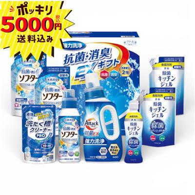 アタック抗菌EX750g・抗菌消臭ソフター(本体350g・詰替300g×2)・除菌キッチンジェル(本体200mL・詰替160mL×2)・液体洗たく槽クリーナーPRO200g