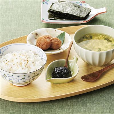 味付のり(8切6枚)・有明海産塩のり(8切6枚)各2、シーラックかつおだし(3袋入)・たまごスープ・オクラ入ねばねば野菜スープ・あおさとわかめのおみそ汁各1、紀州南高梅(1粒入・塩分約8%)×3