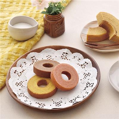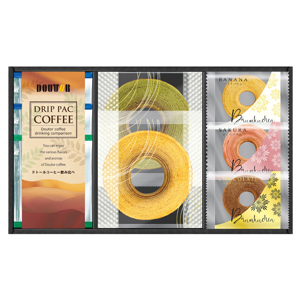 ドトールドリップコーヒー(深煎りブレンド)7g×2、ドトールドリップコーヒー(キリマンジャロブレンド)7g×1、バウムクーヘン(ミルク直径約10.5cm・宇治抹茶直径約10.5cm各1)、ミニバウムクーヘン(バナナ・ベルギーショコラ・桜各1)