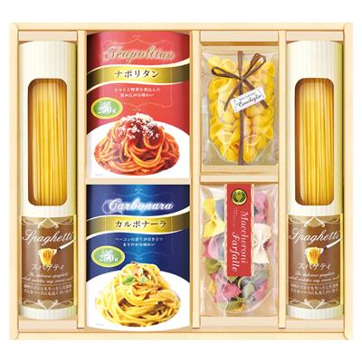 スパゲティ130g×2、マカロニ(コンキリエ)70g・自然色パスタ(ファルファーレ)40g各1、パスタソース(ナポリタン250g・カルボナーラ250g各1)