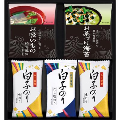 白子のり味付のり(8切5枚)×4、白子だし塩のり(8切5枚)×2、永谷園お茶づけ海苔(5袋入)・永谷園お吸いもの松茸風味(6袋入)各1