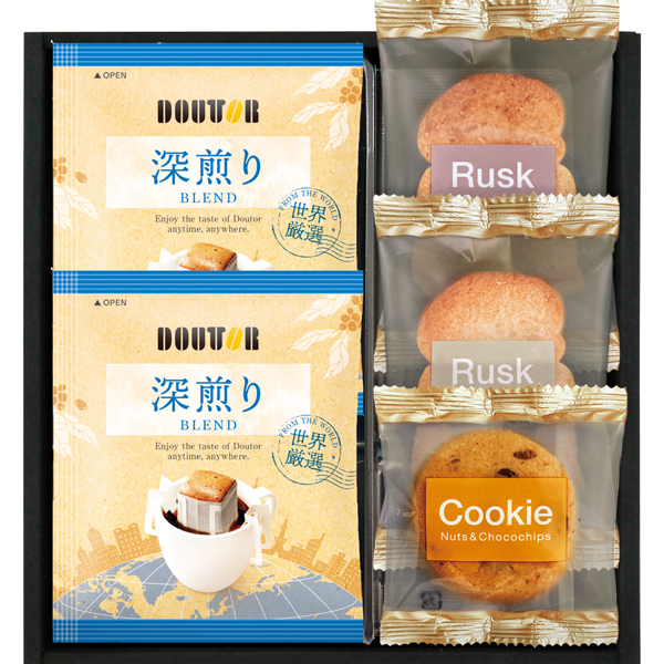 ドトールドリップコーヒー7g×2、ナッツとチョコのざっくりクッキー×1、ラスク(シュガー・ココナッツ各1)