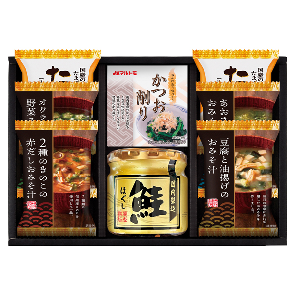 たまごスープ×2、とうふと油揚げのおみそ汁・2種のきのこの赤だしおみそ汁・あおさとわかめのおみそ汁・オクラ入ねばねば野菜スープ・マルトモかつおパック(3袋入)・鮭ほぐし50g各1