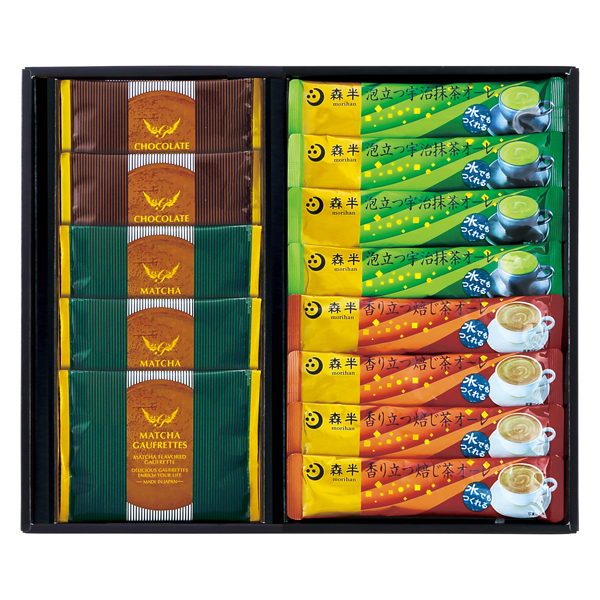宇治抹茶オーレ10g・焙じ茶オーレ10g各4、ゴーフレット(チョコクリーム×2・抹茶クリーム×3)