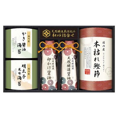 かき醤油海苔(8切6枚)・明太子風味海苔(8切6枚)・卵かけ醤油200mL・天然醸造醤油200mL・本枯れ鰹節(3袋入)各1