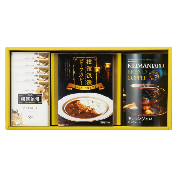 横濱浪漫ビーフカレー180g・キリマンジャロドリップコーヒー(6袋入)各1、アッサム紅茶ティーバッグ×5