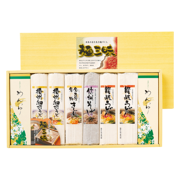 讃岐うどん720g(180g×4袋)、播州細切うどん600g(150g×4袋)、信州そば240g(120g×2袋)、名古屋名物きしめん300g(150g×2袋)、めんつゆ付