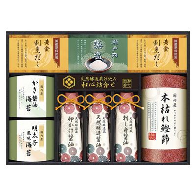 天然醸造醤油200mL・卵かけ醤油200mL・刺し身醤油200mL・かき醤油海苔(8切6枚)・明太子風味海苔(8切6枚)・瀬戸内藻塩50g・本枯れ鰹節(3袋入)各1、黄金割烹だしパック(2袋入)×2