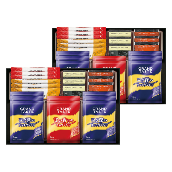 キーコーヒードリップ(リッチブレンド6g×12、モカブレンド6g×4)、キーコーヒースティック(カフェオレ7g・カフェモカ7.8g各6)、キーコーヒーインスタントコーヒー2g・キーコーヒークリーミーパウダー2.5g各6